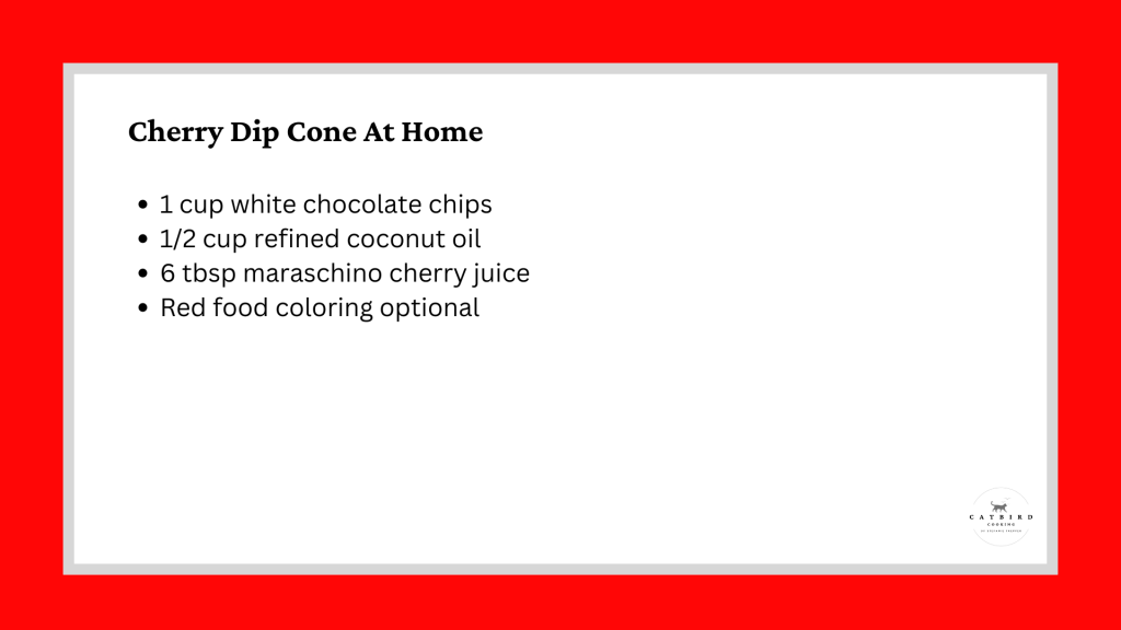 Notes: Red food coloring is optional; without it, your cherry dip will be pink. To avoid staining, don’t wear your favorite white shirt! For the best results, use gel food coloring—start with 1/8 tsp and add more for desired color. If using liquid, start with 3–4 drops and adjust as needed. Use maraschino cherry juice straight from the jar and top your sundae or cone with the cherries.